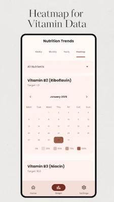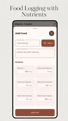 "Vitamin Tracker" অ্যাপটি আপনাকে পুষ্টি ট্র্যাকিংয়ের ক্ষেত্রে এক নতুন অভিজ্ঞতা দেবে। এর বিস্তৃত খাদ্য ডেটাবেসে রয়েছে প্রতিটি খাবারের বিস্তারিত পুষ্টি তথ্য, যেমন বিভিন্ন ভিটামিন, খনিজ পদার্থ এবং ম্যাক্রোনিউট্রিয়েন্টস। আমাদের ব্যবহারকারী-বান্ধব জার্নালে নির্ভুলভাবে আপনার খাদ্য গ্রহণ লগ করুন। পরিবেশনের পরিমাণ পরিবর্তন করুন এবং এমনকি আপনার নিজের খাবার যোগ করেও সূক্ষ্মভাবে পুষ্টি ট্র্যাক করুন। এটি শুধু একটি ক্যালরি কাউন্টার নয়, এটি একটি সম্পূর্ণ পুষ্টি এবং ভিটামিন ট্র্যাকার।